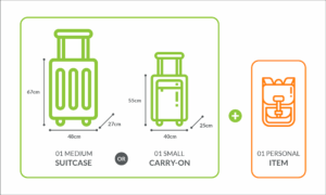 - 1 حقيبة متوسطة الحجم (67 × 48 × 27 سم) أو حقيبة يد صغيرة (55 × 40 × 25 سم)